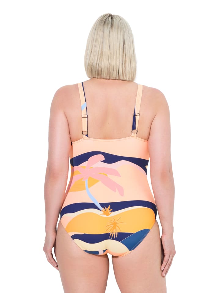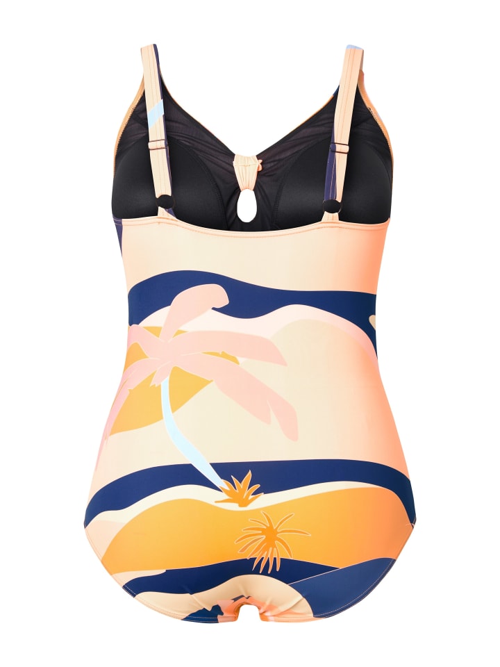 Купальник с мягкими чашечками и летним принтом. Декоративный узел на V-образном вырезе. Регулируемые бретели, пояс под грудью, подкладка спереди. Изготовлено из переработанного полиамида. OEKO-TEX.