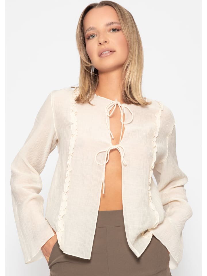 Блузка на завязках светло-бежевого цвета. Эта воздушная блузка сочетает в себе романтическую элегантность и современный комфорт. Нежные оборки спереди придают модели женственность, а классический круглый вырез с завязками создает игривый и универсальный образ. Слегка прозрачный материал из высококачественного хлопка создает воздушный, легкий силуэт, который можно носить как с топом, так и без него. Свободный крой подчеркивает фигуру и обеспечивает комфортную посадку. Изящные разрезы на рукавах добавляют модные акценты и придают блузке изысканную легкость.