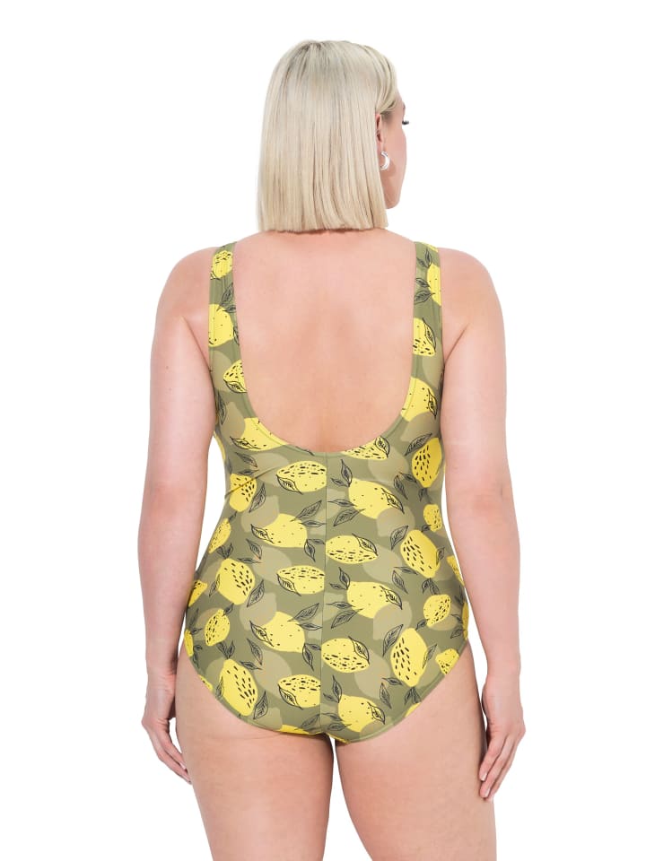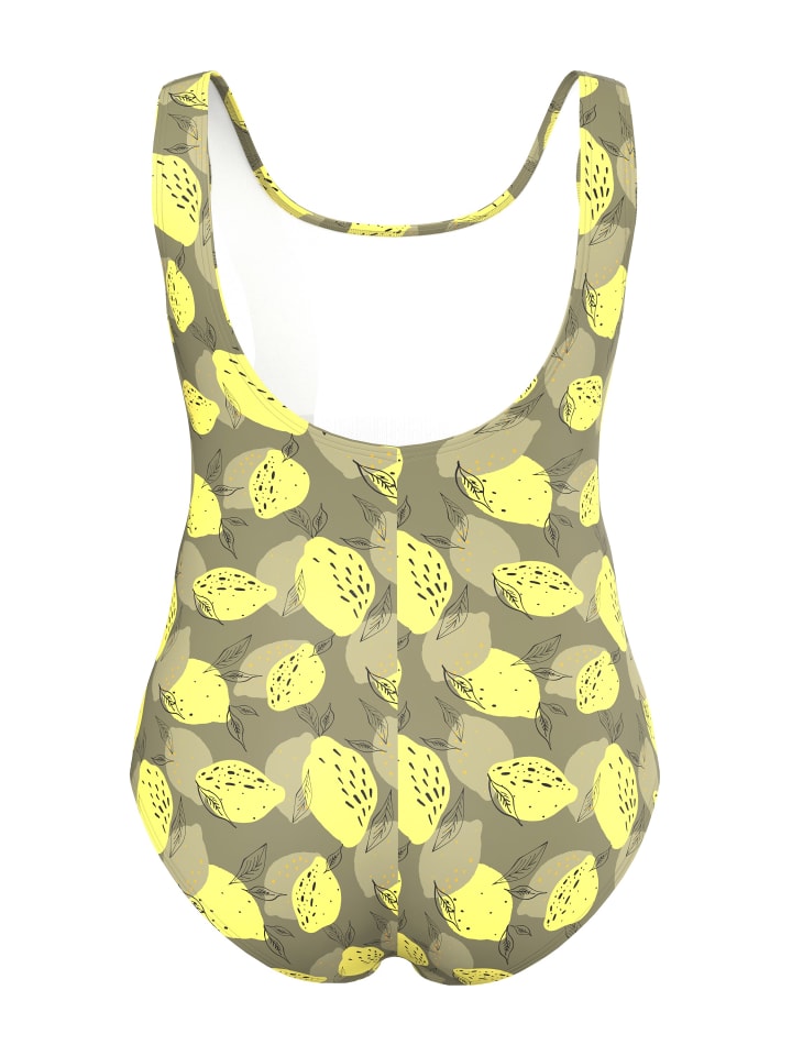 Купальник без мягких чашек, с лимонным узором. Круглый вырез, резинка под грудью, подкладка спереди.