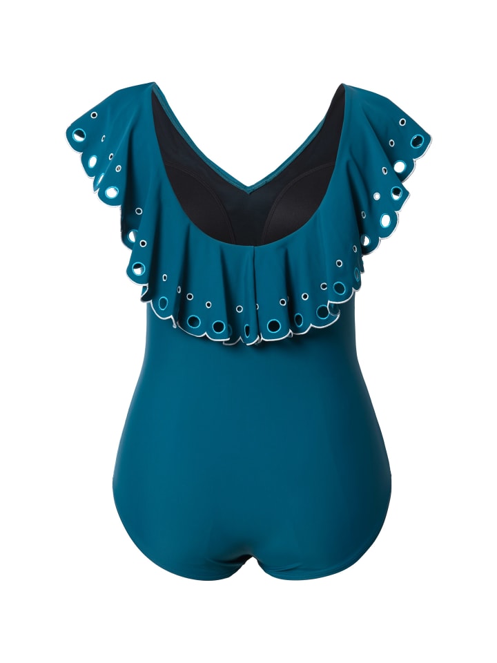 Купальник с декоративным воланом с ажурной вышивкой. Бюст с мягкими чашками и V-образным вырезом, поддерживающая лента под грудью. Мягкая передняя подкладка.