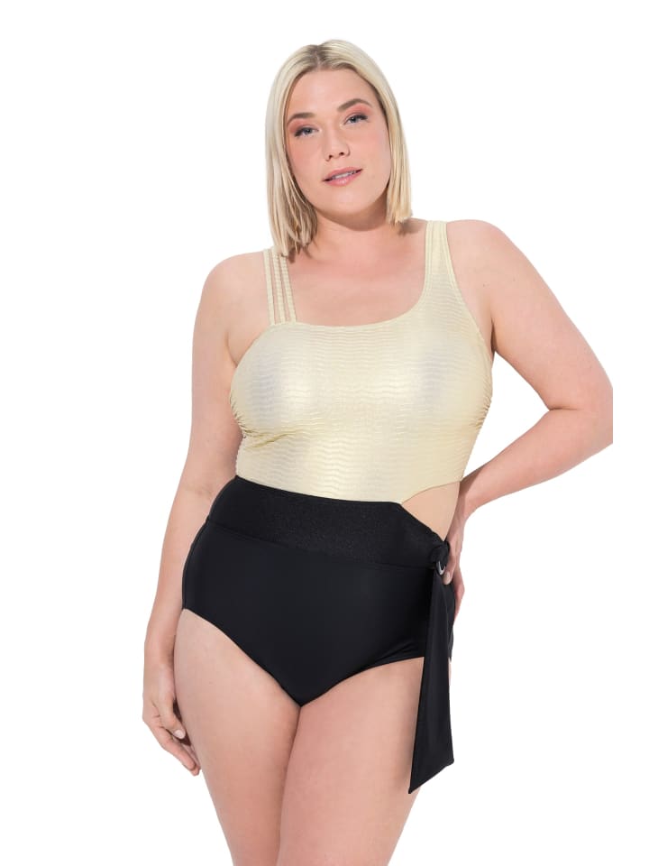 Купальник с мягкими чашками, вырезом по бокам и бюстом с золотистым волнистым узором. Правое плечо с трехсекционным ремнем. Пояс под грудью, подкладка спереди. Изготовлено из переработанного полиамида. OEKO-TEX.