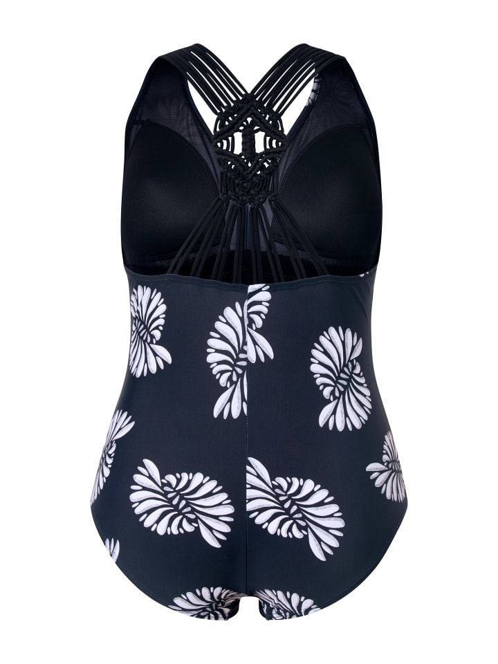 Купальник с мягкими чашками и декоративным принтом. Изюминка: глубокий вырез на спине со вставкой из макраме. Пояс под грудью, подкладка спереди. Изготовлено из переработанного полиамида. OEKO-TEX.