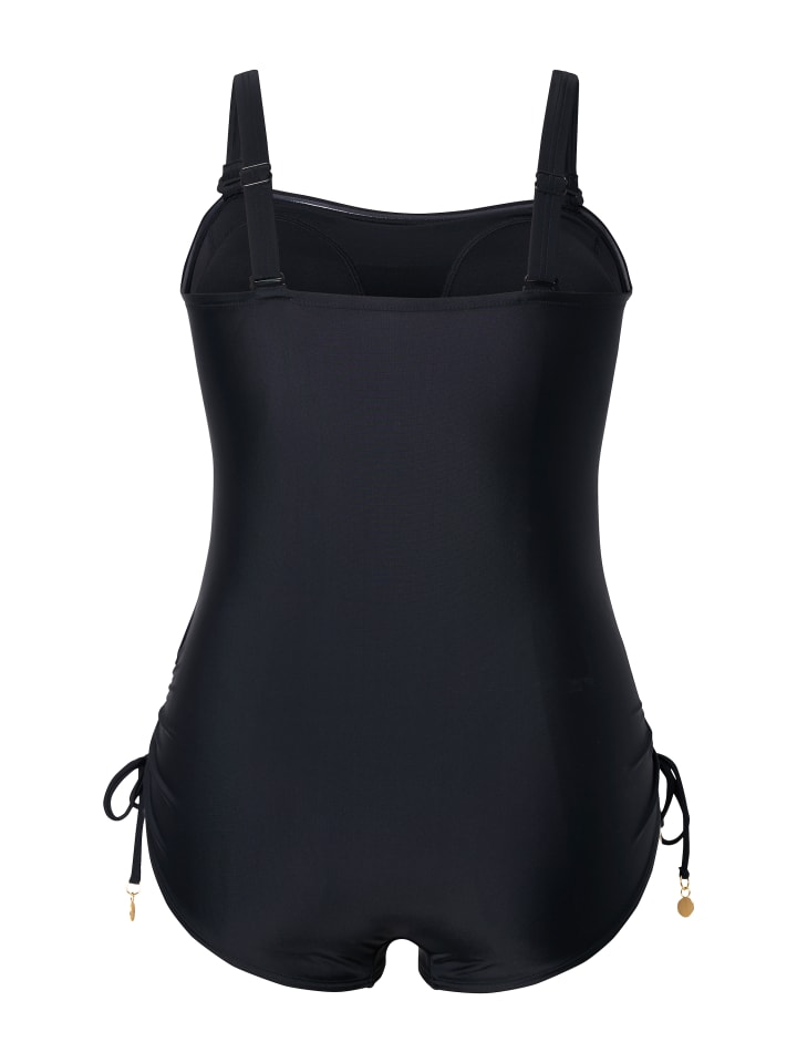 Многосекционный купальник с мягкими чашками и съемными регулируемыми бретелями. Вырез горловины с декоративной окантовкой, прорезиненной изнутри для надежной фиксации. Золотая вышивка пальмами. Декоративные боковые полосы. Пояс под грудью, подкладка спереди. Изготовлено из переработанного полиамида. OEKO-TEX.