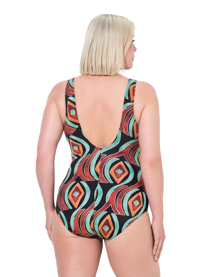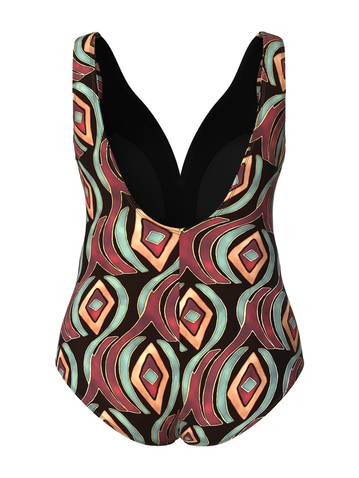 Купальник с мягкими чашками и графическим рисунком. V-образный вырез с металлической застежкой в форме буквы V, резинка под грудью, подкладка спереди. Изготовлено из переработанного полиамида. OEKO-TEX.