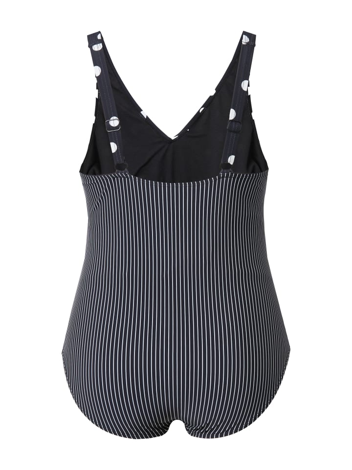 Купальник без мягких чашек. Благодаря боковым сборкам изделие адаптируется к телу, поддерживая его, но не стесняя движений. Идеально подходит для чувствительного живота или во время беременности. Грудь в горошек, снизу тонкие полоски. С поддерживающей резинкой под грудью и эластичной подкладкой спереди. OEKO-TEX.