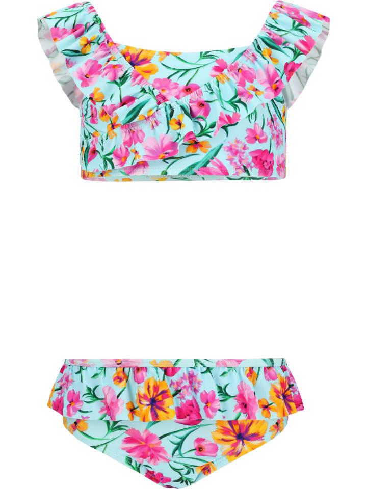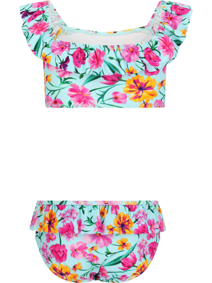 Бикини «Тропическое» навевает летнее настроение — даже в крытом бассейне! Изготовленный из 80% полиамида и 20% эластана, он особенно прочный, эластичный и удобный. Уникальный дизайн оборки создает великолепный визуальный акцент. Вдобавок ко всему, бикини имеет функцию защиты от ультрафиолета, которая защищает детей (в сочетании с солнцезащитным кремом, конечно) от вредных солнечных лучей! - Стильные детские бикини от ZigZag
