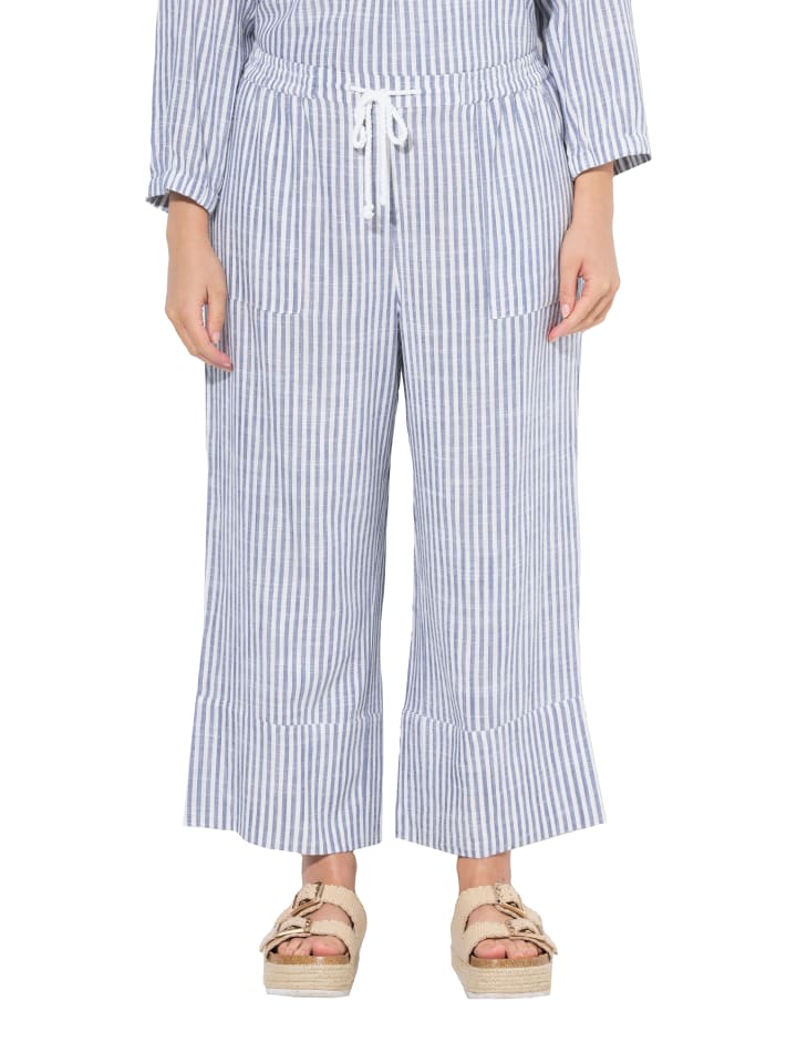 Кюлоты из льняной смеси Rose, выполненные из натуральной прохладной и гладкой льняной смеси с полосками. Эластичный пояс с завязкой, накладные карманы.