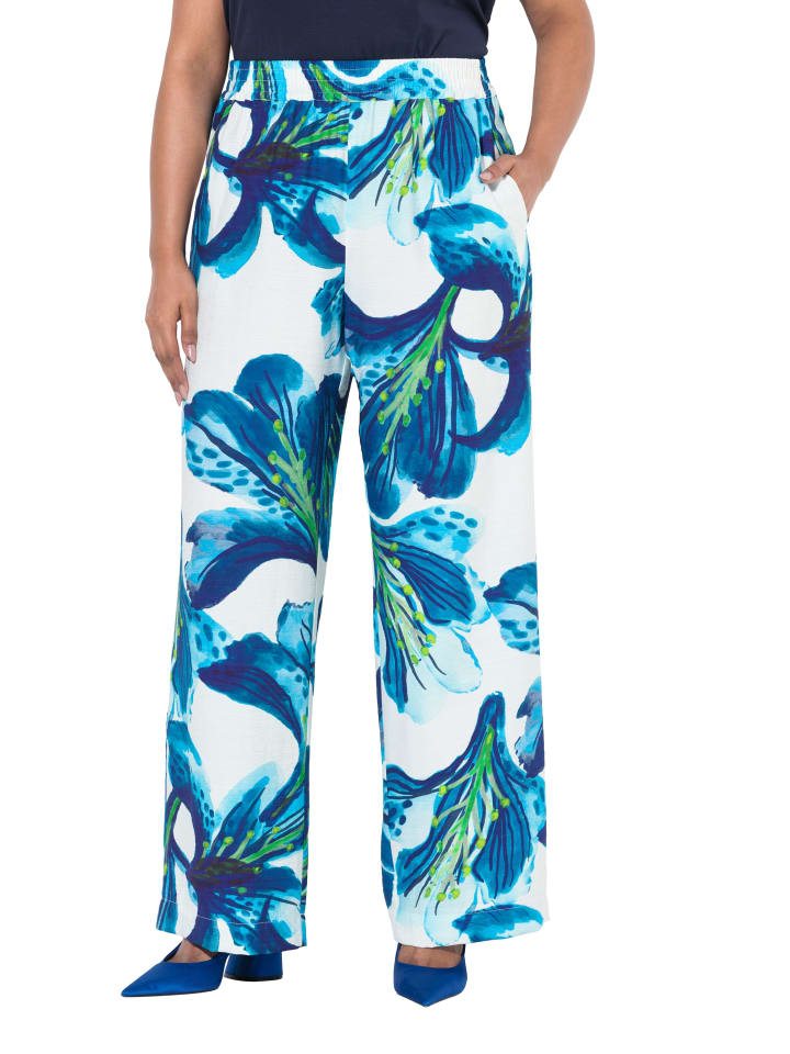 Широкие брюки с цветочным узором. Эластичный пояс с боковыми карманами.