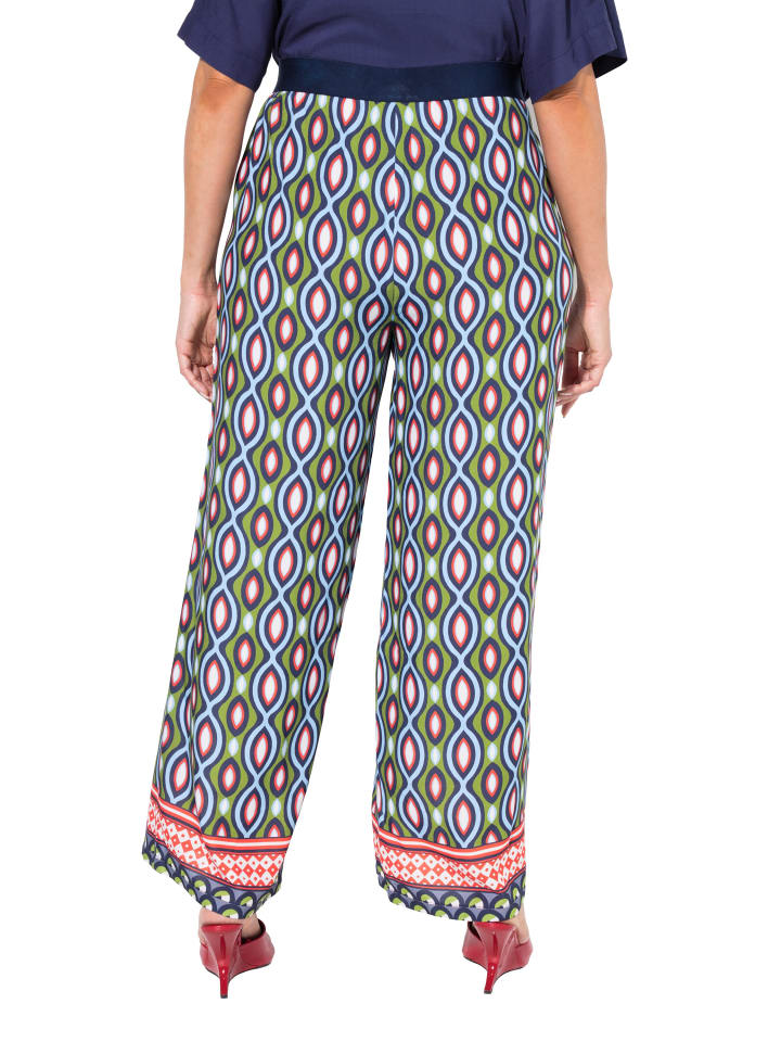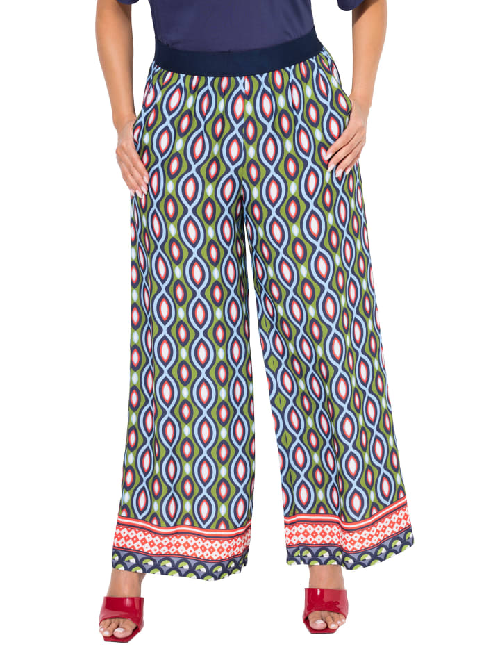 Широкие брюки из мягкой вискозы с графическим рисунком и каймой по низу. Эластичный пояс, 2 кармана.