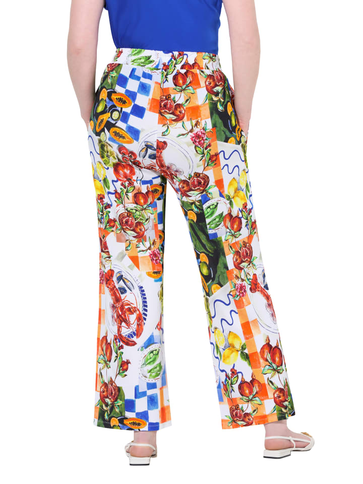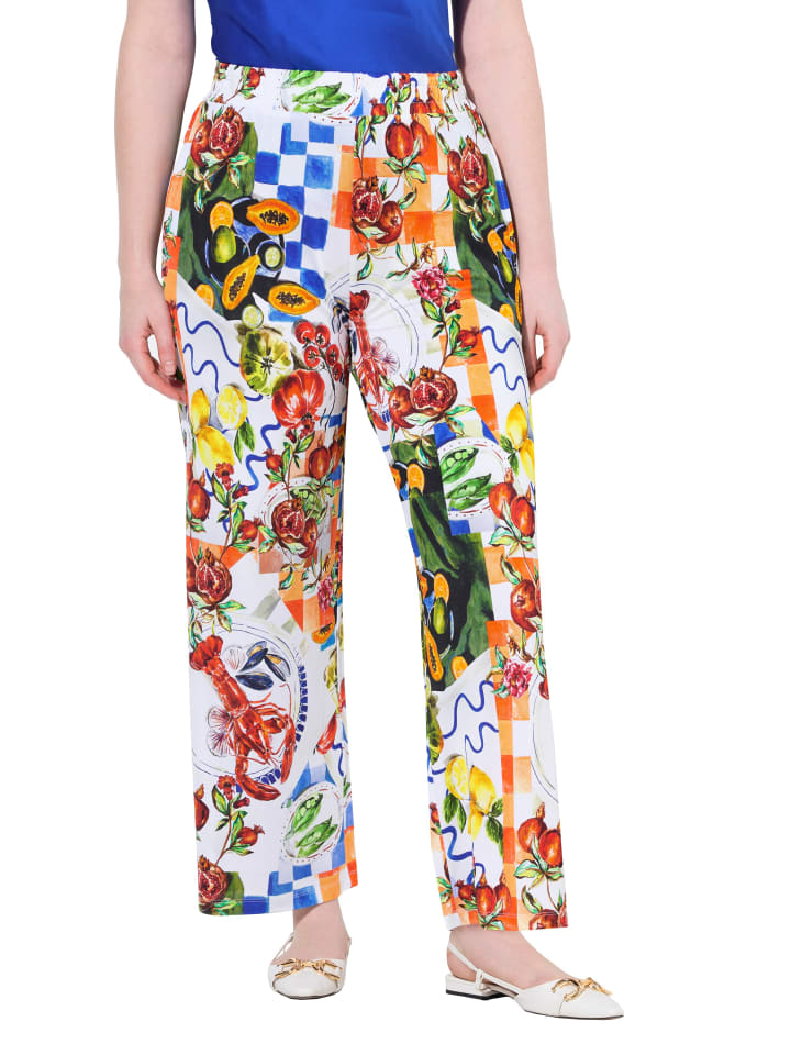 Обтягивающие брюки, широкие, прямого кроя, из тонкой обтягивающей ткани пике с тонкой структурой и современным рисунком в виде заплаток. Эластичный пояс, всегда удобный.