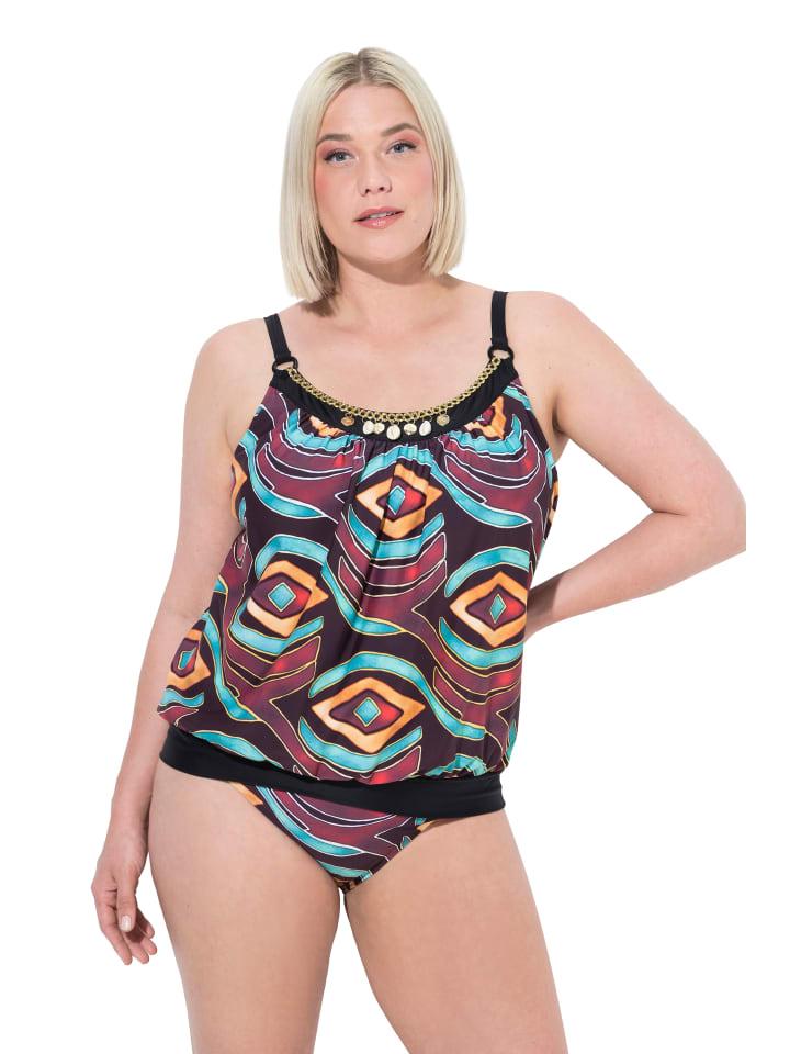 Танкини, состоящий из двух частей, с мягкими чашками и эластичным подолом, всегда обеспечивает комфортную посадку. Графическая печать. Удлиненный верх, декоративная кайма на круглой горловине, регулируемые бретели и поддерживающая лента под грудью. Подходящие трусы. Изготовлено из переработанного полиамида. OEKO-TEX.