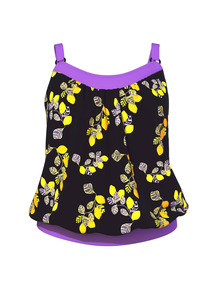 Танкини, состоящий из двух частей, с мягкими чашечками и цветным эластичным подолом, всегда обеспечивает комфортную посадку. Узор «Свежий лимон». Удлиненный топ с цветным круглым вырезом, регулируемыми бретелями и поддерживающей лентой под грудью. Подходящие трусы. OEKO-TEX.