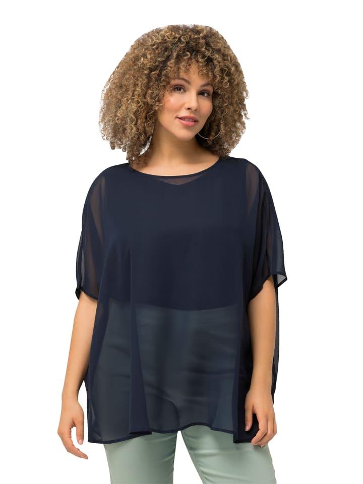 Шифоновая блузка, свободного покроя, выполнена из слегка прозрачного шифона. Круглый вырез, широкие спущенные плечи.