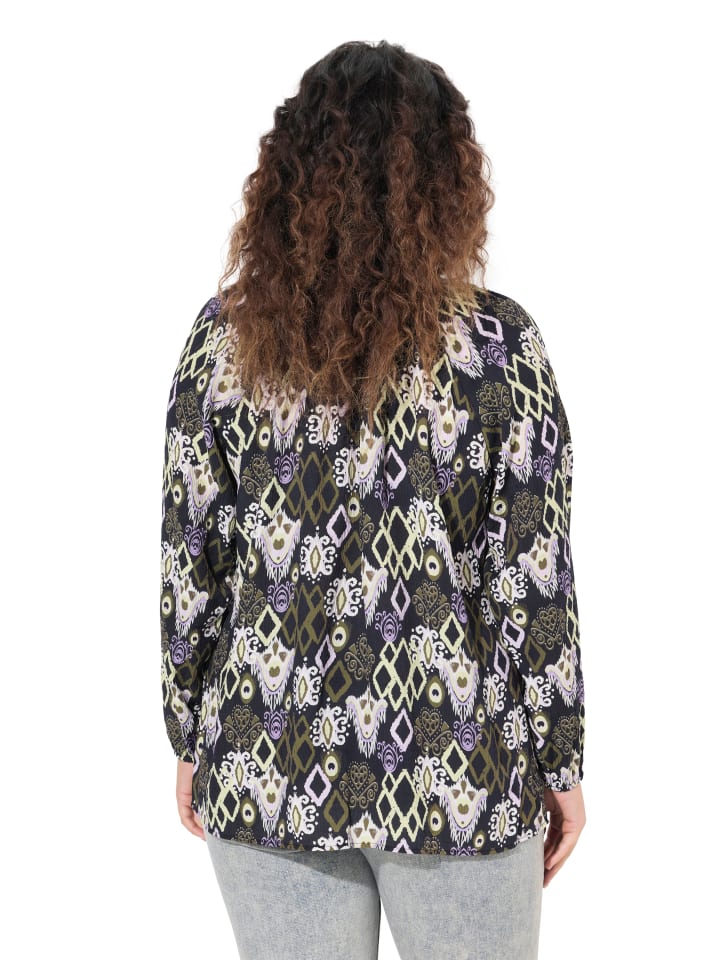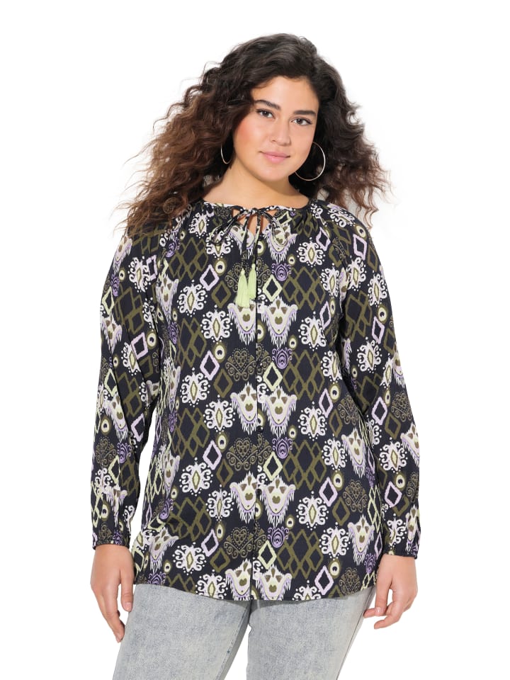 Блузка прямого кроя из мягкой вискозной смеси с принтом по всей поверхности. Круглый вырез с разрезом и завязкой, планка с пуговицами. Длинные рукава реглан с эластичными манжетами.