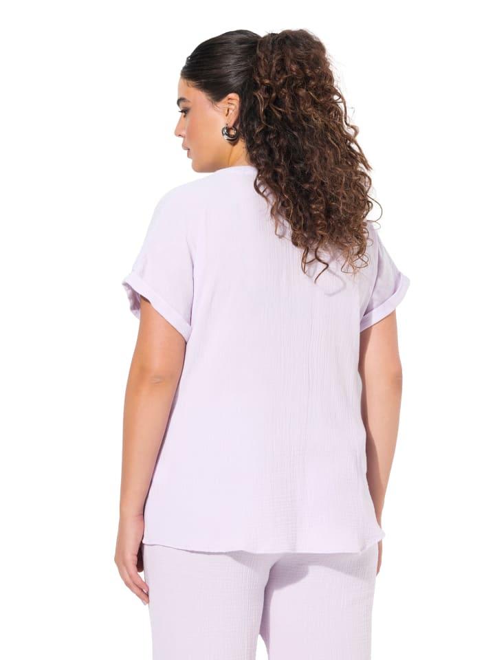 Блузка свободного кроя из муслина с тонкой структурой. Туниковый вырез с короткой застежкой на пуговицы, спущенная линия плеча, короткие рукава с отворотом. Нагрудный карман. Закругленный подол, прибл. Сзади на 12 см длиннее.