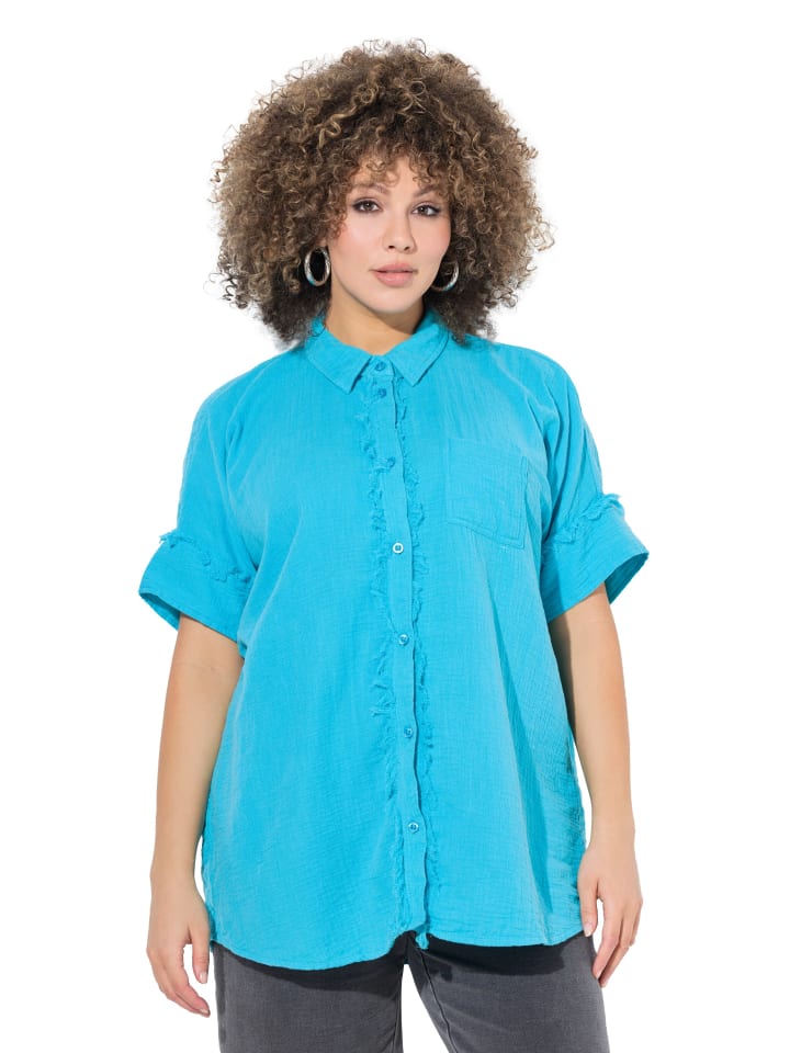 Блузка из муслина, свободного покроя, с типичной структурой и закругленным бахромчатым подолом. Воротник рубашки, планка на пуговицах, нагрудный карман. Заниженная линия плеча, короткие рукава с манжетами.