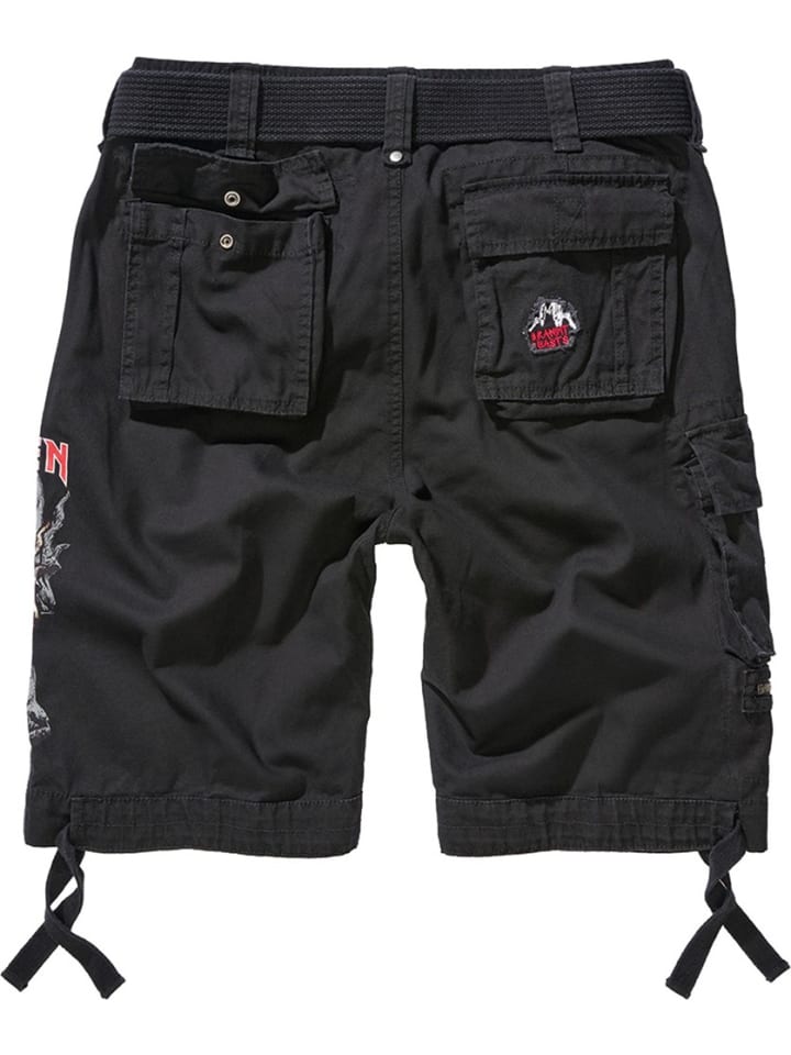 Шорты-карго Iron Maiden "Notb" вкл. Пояс с принтом / Широкие штанины / Вышитый карман на штанине справа, большой принт Iron Maiden слева / 1 накладной мини-карман / 2 задних кармана, 1 карман с вышивкой Brandit Beasts / Металлический значок с логотипом Eddy The Beast / Этикетка Iron Maiden «Brandit Beasts» / Пуговицы с логотипом