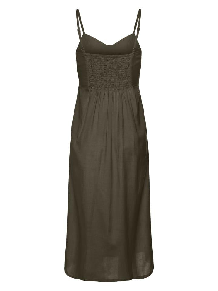 Платье от Lascana с декоративной планкой на пуговицах спереди. Регулируемые тонкие бретельки. Дымовая вставка сзади. Юбочная часть актуальной длины миди до икры. Длина юбки ок. 82 см. Легкое и мягкое качество, изготовленное из 58% вискозы, 28% хлопка (поддерживает хлопок, произведенный в Африке), 14% льна. - Модная длина миди