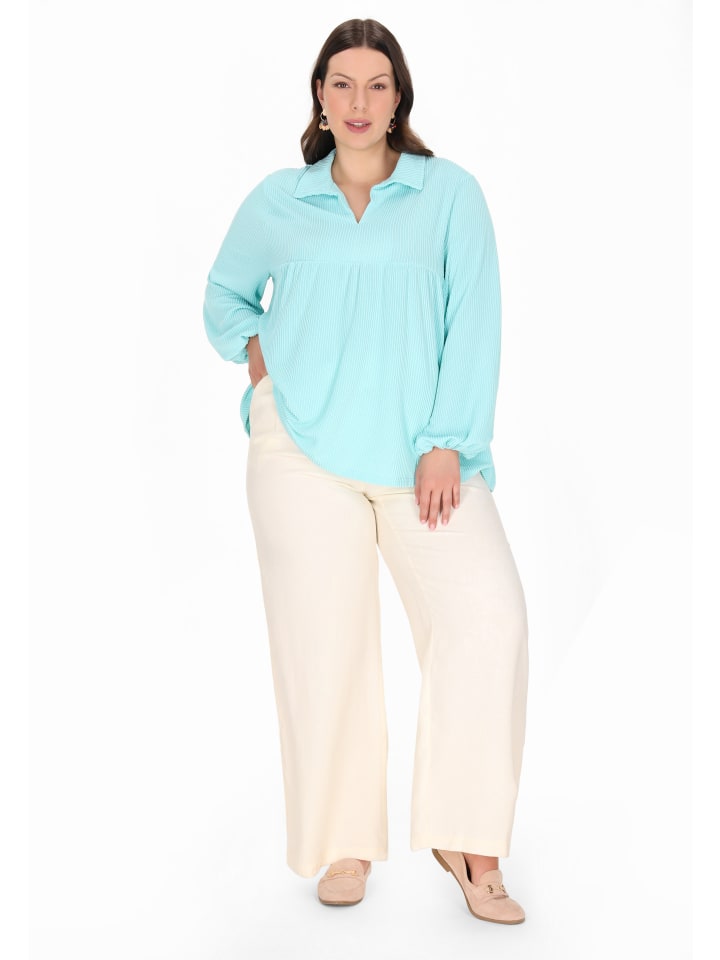 Откройте для себя стильную блузку из нашей коллекции Plus Size, которая переосмысливает повседневную элегантность. Эта блузка с V-образным вырезом имеет классический воротник и длинные рукава, идеально подходит для повседневной носки. Свободный крой добавляет ей привлекательности, а эластичные манжеты обеспечивают комфорт. Изготовленная из полосатого трикотажного полотна, она является идеальным сочетанием комфорта и шикарного стиля.