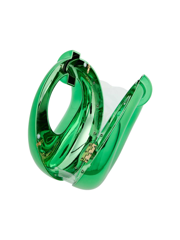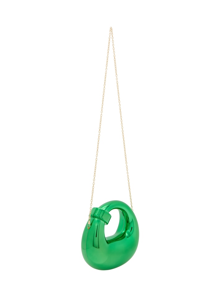 Откройте для себя скульптурную сумочку с гладкой, округлой формой и круглым отверстием для элегантного штриха. Небольшой цилиндрический акцент добавляет асимметрии, в то время как глянцевая поверхность усиливает ее современную привлекательность. Мягкие контуры придают ей современный вид, идеально подходящий для вечеринок или галерейных выставок. Дополнена дополнительной цепочкой для универсальности и декоративной застежкой для дополнительного стиля.
