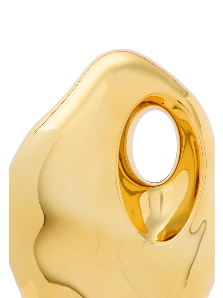 Представляем скульптурную вазу с органической формой и гладкой, глянцевой поверхностью, которая прекрасно отражает свет. Ее асимметричная форма отличается мягкими изгибами и круглым отверстием для цветов или декора. Эта стильная вещь вызывает в памяти современное искусство, обеспечивая при этом устойчивость в различных условиях. Идеально подходит для вечеринок, включает в себя дополнительную цепочку и декоративную застежку.
