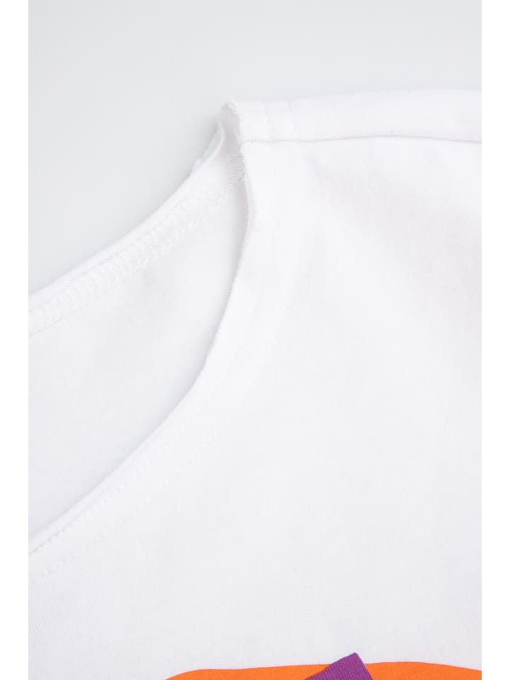Передняя часть рубашки украшена красочным принтом с растительными мотивами и надписями, который привлекает внимание и добавляет энергии любому наряду. Белая футболка прекрасно сочетается с самой разной одеждой: от джинсов до юбок.