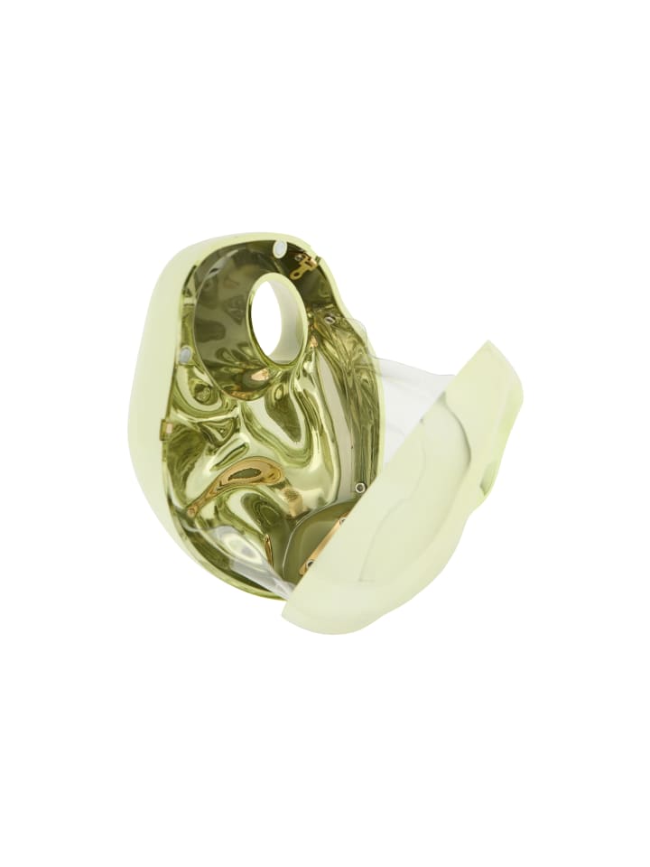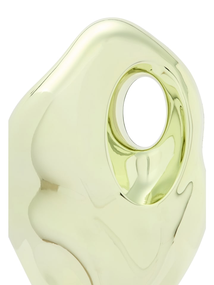 Представляем скульптурную вазу с органической формой и гладкой, глянцевой поверхностью, которая прекрасно отражает свет. Ее асимметричная форма отличается мягкими изгибами и круглым отверстием для цветов или декора. Эта стильная вещь вызывает в памяти современное искусство, обеспечивая при этом устойчивость в различных условиях. Идеально подходит для вечеринок, включает в себя дополнительную цепочку и декоративную застежку.