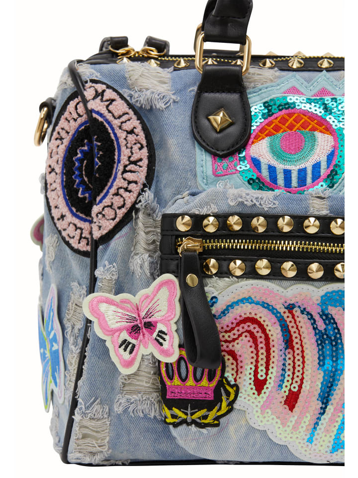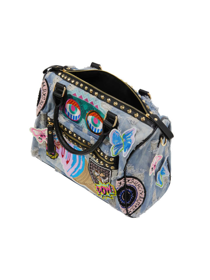 Эта модная сумка имеет структурированный дизайн с двумя ручками для удобства переноски. Основное отделение имеет надежную застежку-молнию, дополненную дополнительным внешним карманом на молнии для удобства. Украшенная джинсовым узором и яркими абстрактными узорами и игривыми нашивками, эта стильная вещь идеально подходит для любого случая, предлагая как стиль, так и функциональность.