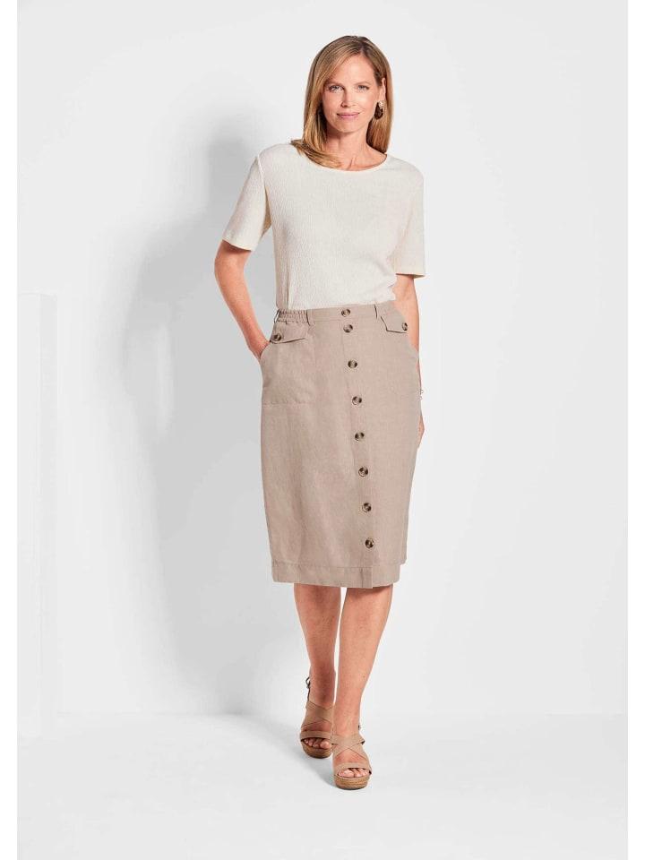 Юбка в спортивном стиле карго: характерные черты — боковые карманы с дополнительными клапанами и пуговицей, а также планка с пуговицами спереди. Три нижние кнопки можно расстегнуть для большей свободы движений. Тонкая молния по центру спинки облегчает надевание и снятие. Удобный частично эластичный пояс со шлевками для ремня, подол отделан декоративным швом. Изготовлено из льняно-хлопчатобумажной ткани без подкладки с терморегулирующими свойствами. - С частично эластичным поясом и тонкой молнией