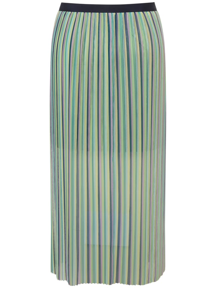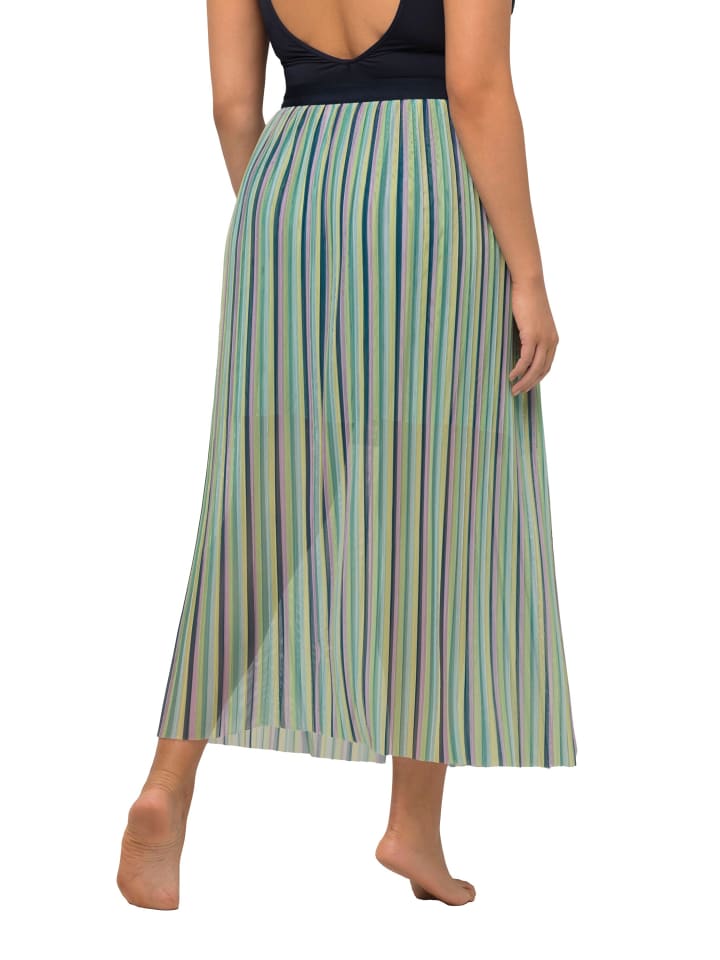 Юбка-бандаж, длины миди, выполнена из мелко плиссированной сетки с цветными полосками. Пояс на кнопках и завязках, отрезной подол.