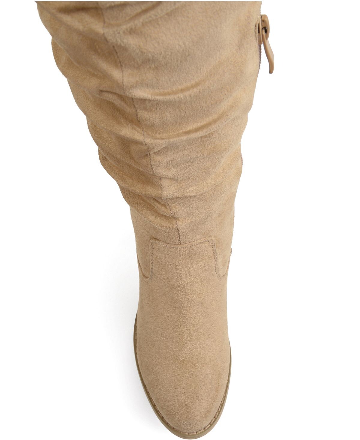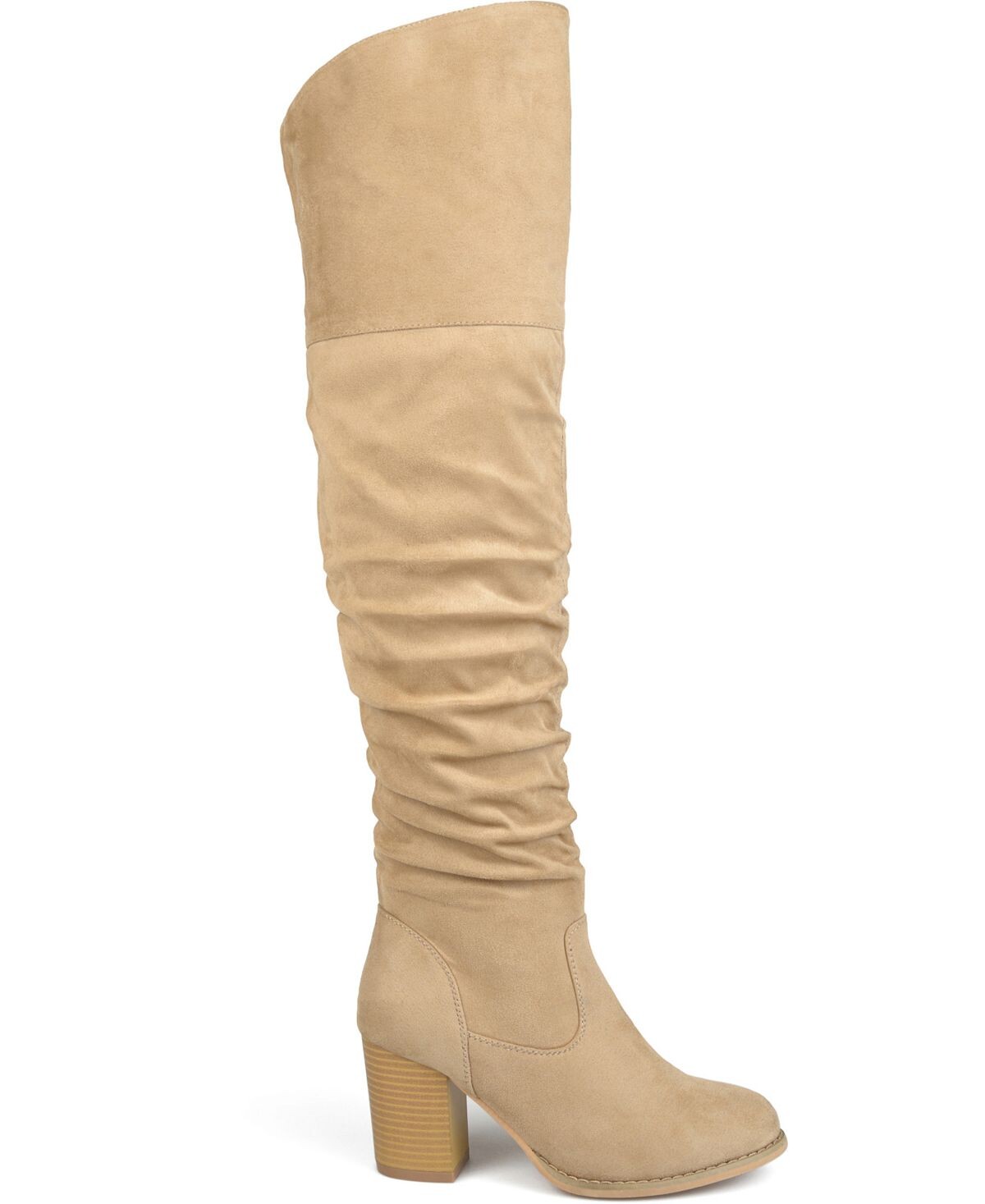 Сапоги выше колена со сборками от Journee Collection имеют верх из мягкой искусственной кожи (полиуретана, полиэстера), возвышающийся над коленями, с рельефными союзками, создающими стильные детали. Закругленный носок и массивные высокие каблуки завершают образ.