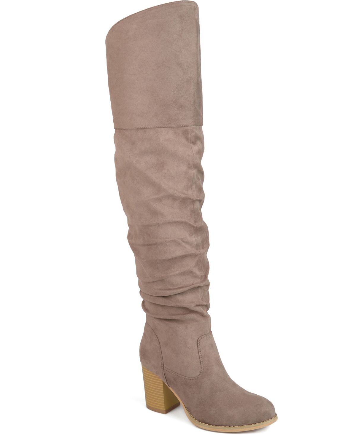 Сапоги выше колена со сборками от Journee Collection имеют верх из мягкой искусственной кожи (полиуретана, полиэстера), возвышающийся над коленями, с рельефными союзками, создающими стильные детали. Закругленный носок и массивные высокие каблуки завершают образ.