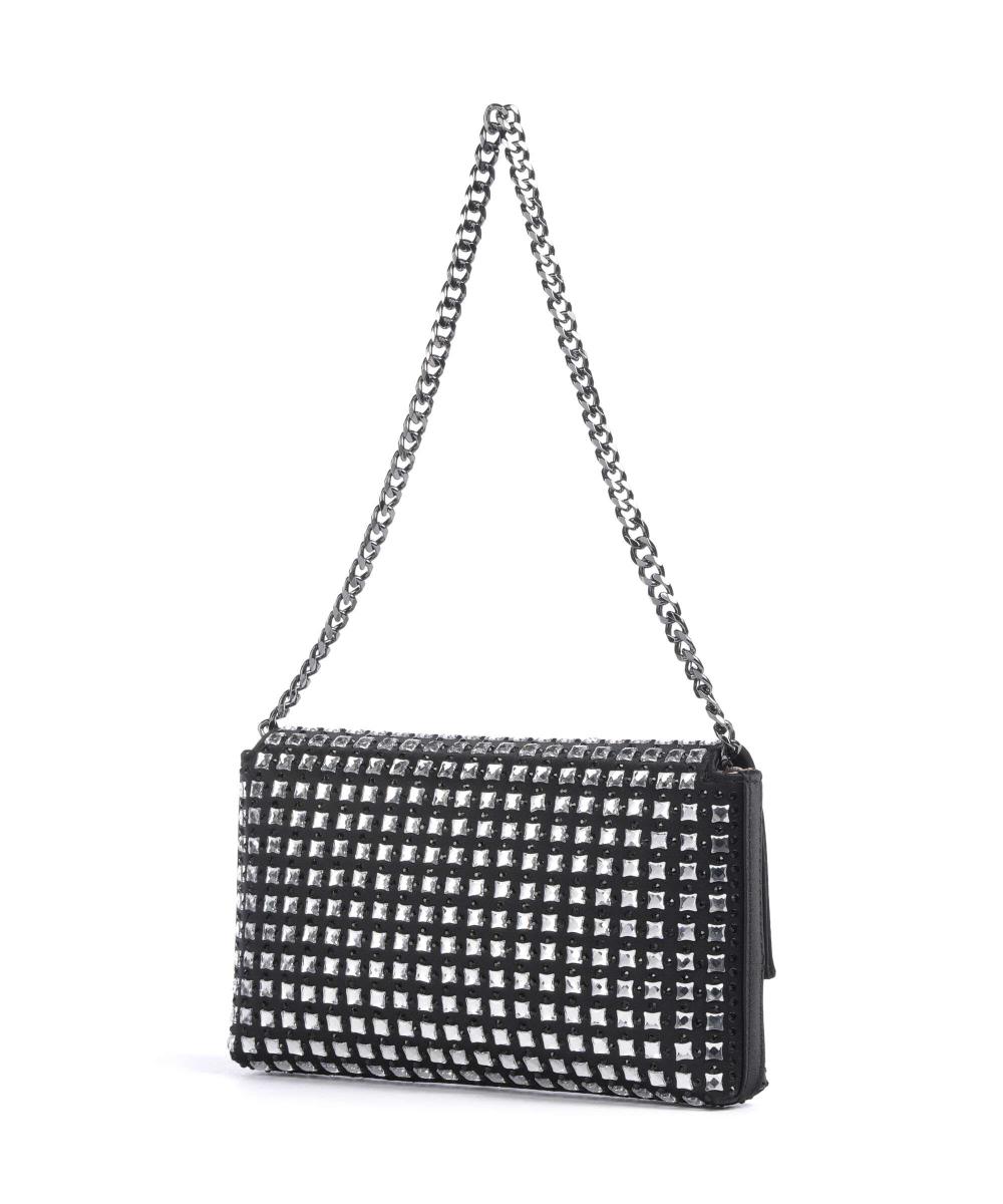 Подробности о товаре: Закрывается на магнитную застежку. Съемная ручка для переноски (высота ручки 21 см). Декоративные камни. Металлическая фурнитура цвета антрацита. Внутри: Подкладка с логотипом из полиэстера. Одно основное отделение. Отделения для кредитных карт. Материал: полиэстер. Размеры: прибл. 20 x 12 x 3 см (ширина x высота x глубина). Вес: 0,3 кг.