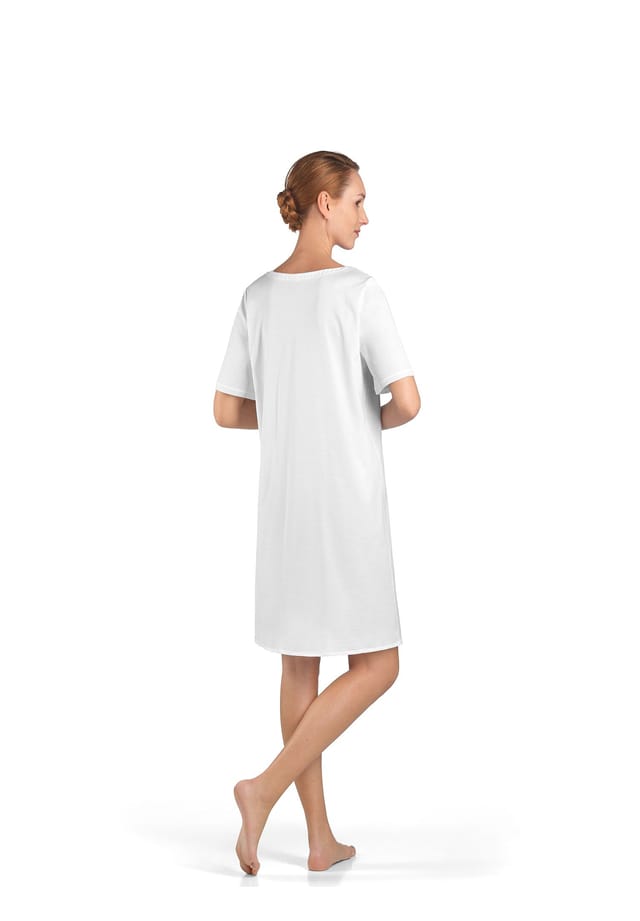 Описание товара: Удивительно удобный, 100% мерсеризованный хлопок в качестве одинарного джерси играет главную роль в этой ночной рубашке с короткими рукавами из серии Cotton Deluxe. Модель также выигрывает за счет удобного кроя А-силуэта, нежной отделки вуалью на вырезе горловины и накладного нагрудного кармана. Особенности : Нежная отделка вуалью на круглом вырезе горловины Легкий одинарный джерси Длина 90 см, короткие рукава с нагрудным карманом Примечание к размеру: Изделие соответствует размеру Длина: до колена Вырез: Овальный вырез Длина рукава: Короткий рукав