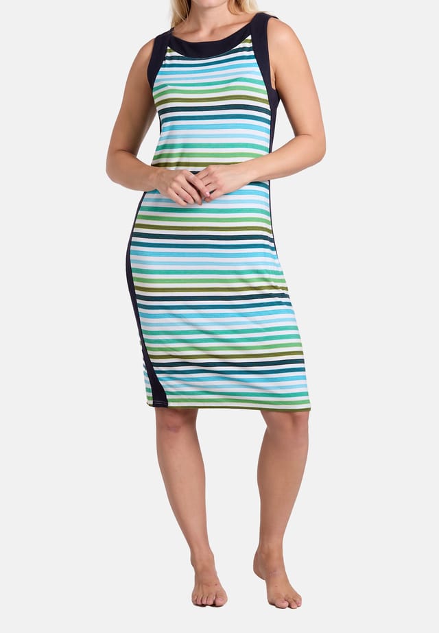 Описание товара: Это пляжное платье впечатляет своим облегающим кроем и модным полосатым узором, который создает модный образ. Безрукавный дизайн и длина до колена делают его идеальным компаньоном для теплых дней на пляже или у бассейна. Платье из эластичного материала обеспечивает высокий комфорт при ношении и свободу движений. Идеально подходит для расслабленных моментов и повседневных прогулок. Особые характеристики (Bullets): Эластичный материал Высокий комфорт при ношении Модный вид Информация о размере: Изделие идет размер в размер Вид спорта: Плавание