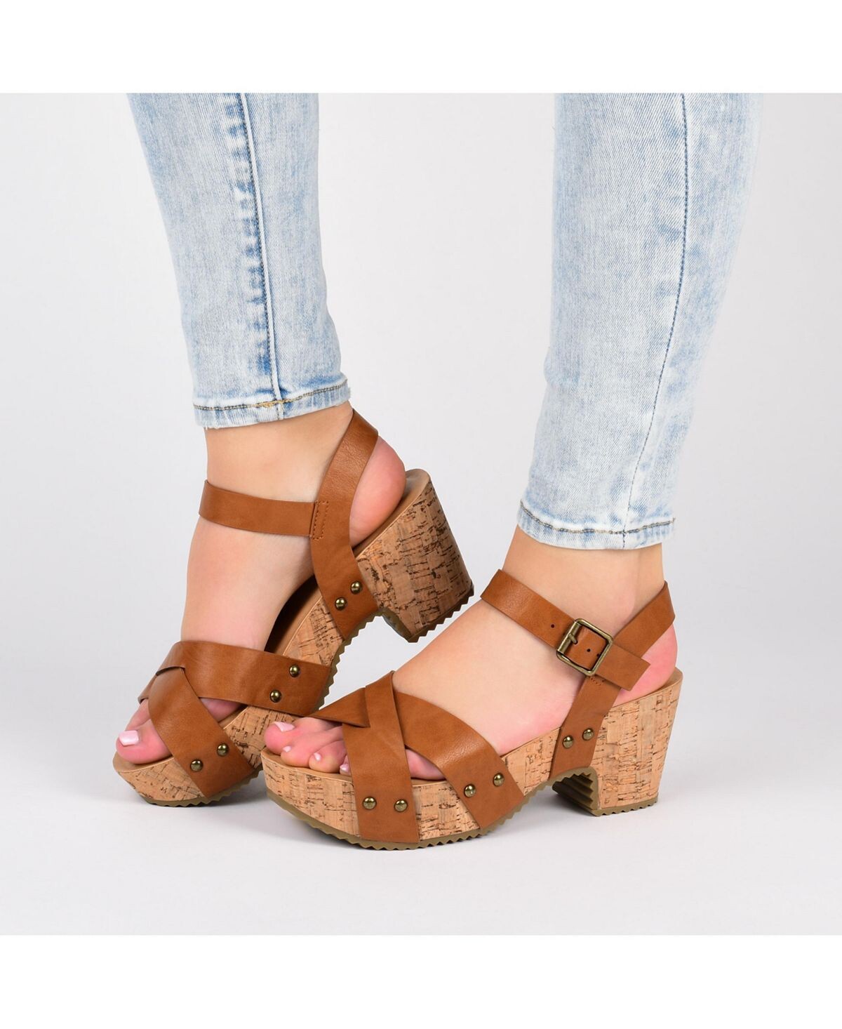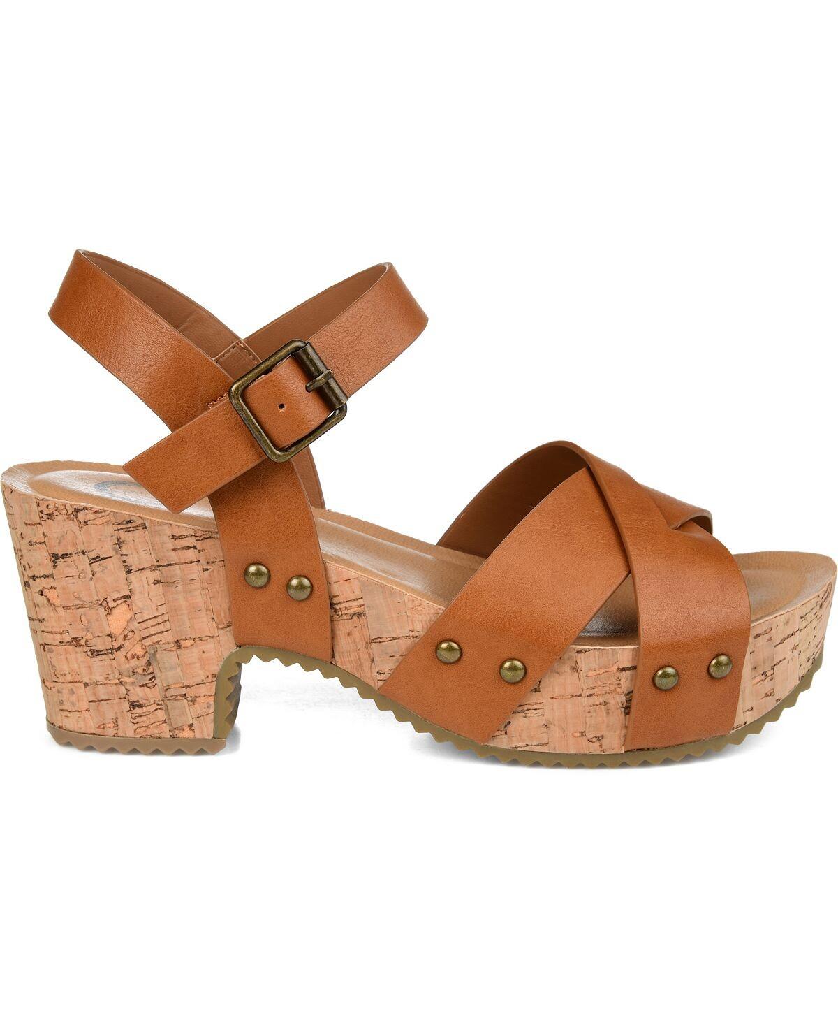 Перекрещивающиеся ремешки на носке и каблук из синтетической пробки великолепно смотрятся на сандалиях Valentina из коллекции Journee. Эти шикарные сандалии украшены яркими заклепками и ремешком на щиколотке с модной квадратной пряжкой.