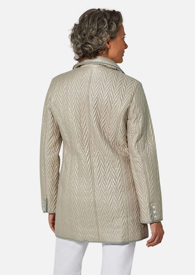 Описание товара: Длинная стеганая куртка, которая привлекает внимание своим привлекательным стеганым видом. Удлиненный покрой и легкая подкладка, идеально подходит для прохладных дней. Швы «принцесса» спереди и сзади обеспечивают идеальную посадку. Подол и планка с пуговицами искусно отделаны контрастным цветом. Небольшая прорезь с тремя кнопками на концах рукавов говорит о детальном мастерстве. Чтобы защитить от ветра, молния имеет дополнительную планку с пуговицами. С двумя карманами на молнии, внутренним карманом на подкладке и карманом для мобильного телефона. Кнопки и бегунок молнии с элегантным тиснением. Длина около 83 см для размера 46, около 100 см. 79 см в размере 50. 23.