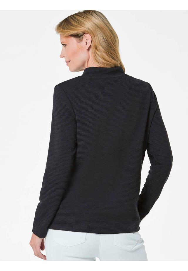 Описание товара: Толстовка с изысканным воротником-стойкой, заканчивающимся привлекательной буквой V спереди. Соответствующий шнур с металлическими концами проходит через металлические люверсы и может быть завязан в бант по желанию. Эта толстовка длиной до бедер имеет свободный крой. Трикотажная ткань с высоким содержанием вискозы и эластана обеспечивает мягкость и исключительный комфорт. Структурированная поверхность с горизонтальным ребристым рисунком особенно привлекает внимание и является стильным повседневным спутником. Длина около 66 см для размера 46, около 50 см для размера 46. 62 см в размере 50. 23.