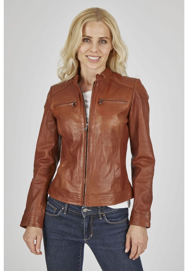Описание товара: Эта спортивная женская кожаная куртка от 7eleven изготовлена из тонкой кожи наппа растительного дубления из овчины. Воротник-стойка, декоративная строчка на плечах и спине, а также прорезные карманы на кнопках создают повседневный образ. Кант дополнительно привлекает внимание. Современный крой этой кожаной куртки обеспечивает отличную посадку, которая прекрасно демонстрирует вашу фигуру. Номер модели: SEL-Greta7E