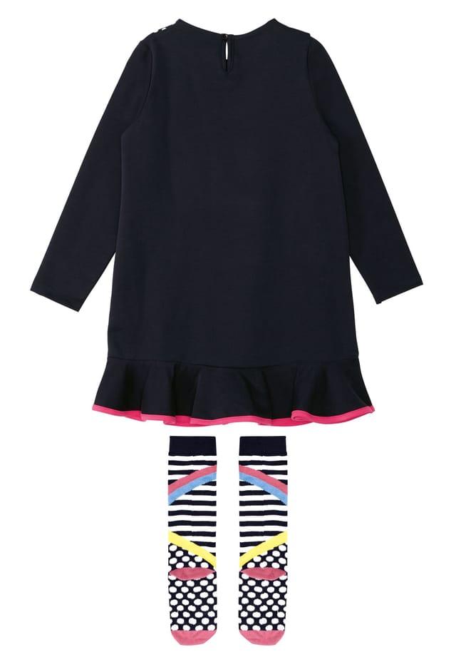Описание товара: Комплект, состоящий из платья и гольфов. Платье из хлопчатобумажной ткани средней плотности с набивным воротником и оборками по подолу. Вся продукция Denokids производится в соответствии с правилами безопасности детей.