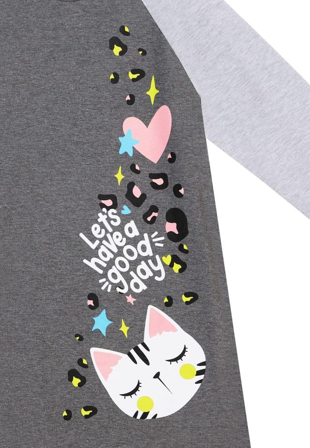 Описание товара: Платье из хлопка средней толщины с длинными рукавами цвета антрацитового меланжа. С принтом в виде кошки. Крой трапеции. Для создания комплекта можно приобрести соответствующие кроссовки. Вся продукция Denokids производится с учетом безопасности детей.