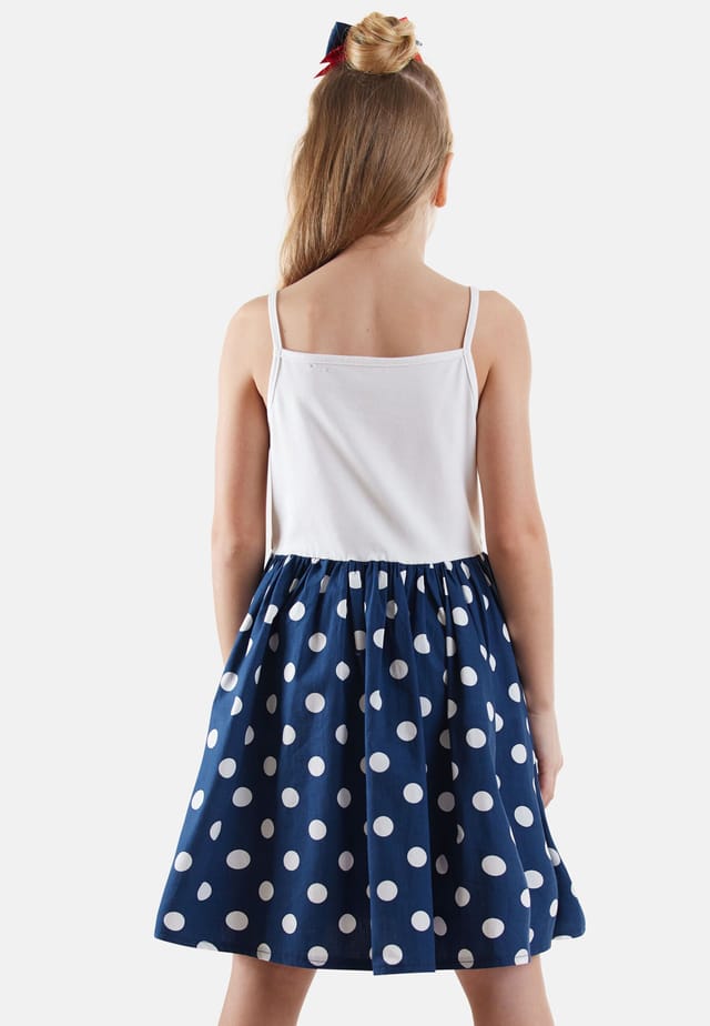 Описание товара: Летнее платье из хлопка на тонких бретельках. Верх из чесаного хлопка, приталенный, с милым принтом в виде мышки. Юбка из хлопкового поплина в горошек. Вся продукция Denokids производится в соответствии с правилами безопасности для детей.