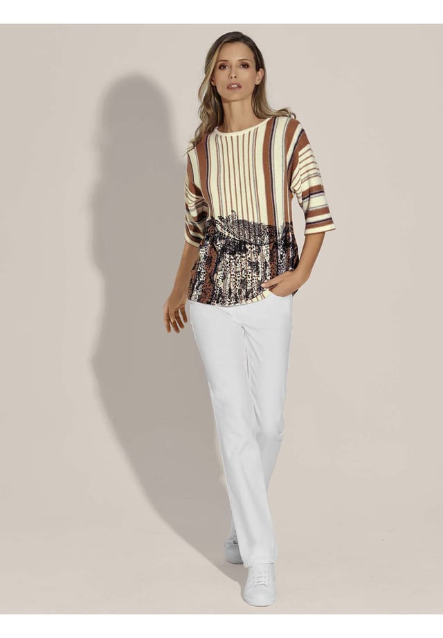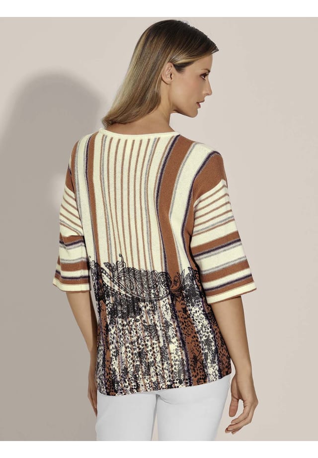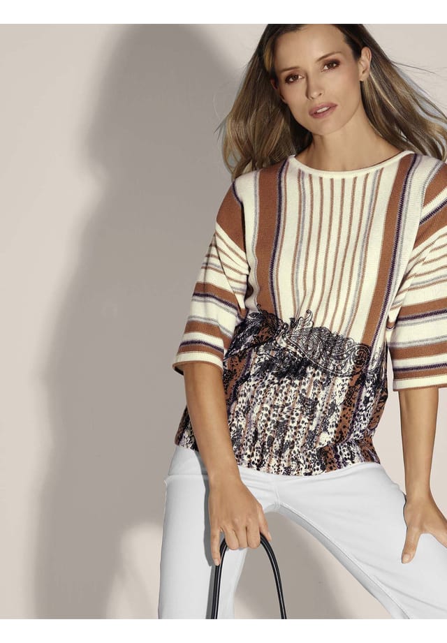Описание товара: Смесь пряжи мериносовой шерсти и кашемира делает этот свитер настоящим опытом ношения. Пушистый и мягкий, он имеет уникальный вид. Привлекательный полосатый дизайн трикотажного партнера подчеркивается в нижней половине контрастным принтом пейсли, создавая захватывающее модное заявление. Рисунок принта варьируется от модели к модели, делая каждую вещь драгоценной единственной в своем роде! Повседневный силуэт фасона свободно облегает фигуру и отличается вырезом-лодочкой и широкими рукавами длиной 3/4. Стиль свитера, который можно комбинировать разными способами и всегда расставлять модные акценты.