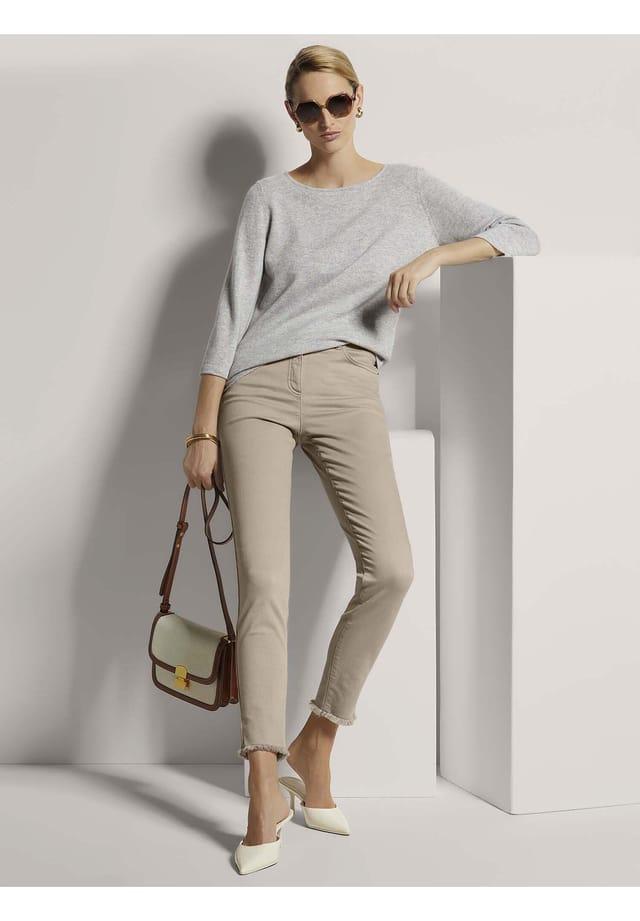 Описание товара: Первоклассный трикотаж для многих случаев. Этот роскошный свитер тонкой вязки сам по себе является изюминкой, но также и под блейзером и курткой. Высококачественный трикотаж из тончайшего двухслойного кашемира, он мягкий, легкий как перышко и удивительно эластичный. Этот кашемировый свитер — особенный базовый продукт. Побалуйте себя несравненным комфортом для вашей кожи! Модный прямой крой с вырезом-лодочкой, рукавами длиной 3/4 и плоскими манжетами — это придает свитеру красивый повседневный вид.
