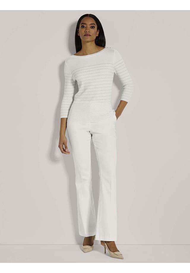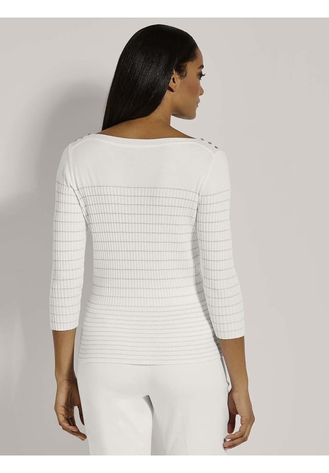 Описание товара: С модным коротким свитером вы всегда добавите немного шика в свой образ! Художественное сочетание простой и ребристой вязки прерывается полосками металлической пряжи, добавляя нотку гламура. Женственный вырез лодочкой и привлекательные рукава три четверти подчеркивают модный стиль. Декоративные пуговицы на плече добавляют изысканные акценты.