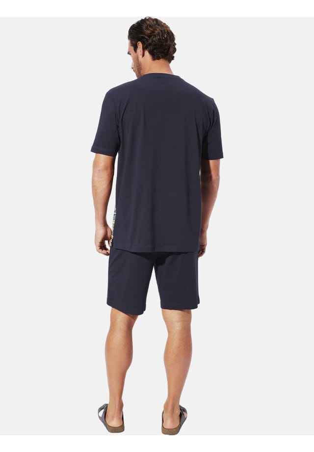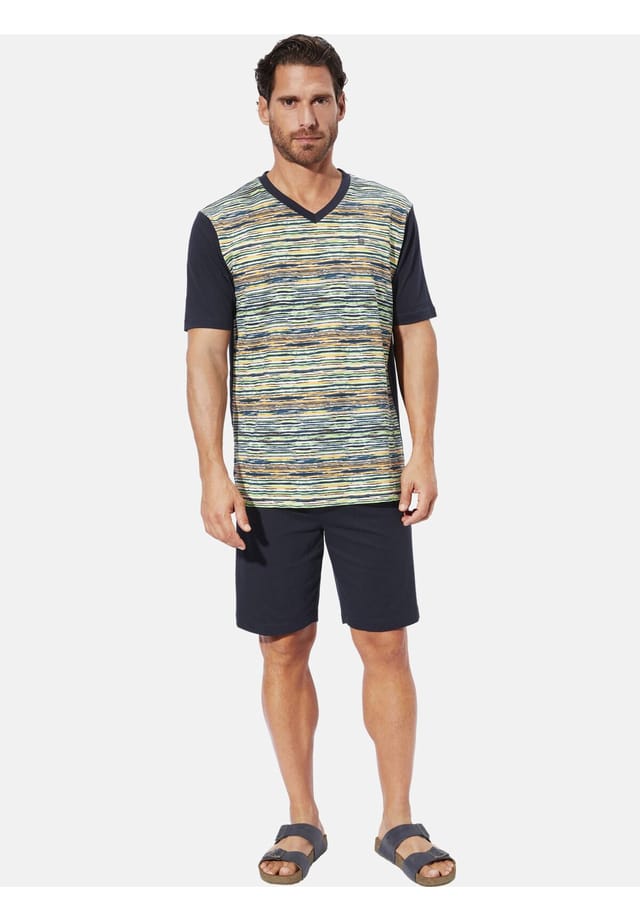 Описание товара: BABISTA вдохновляет модных мужчин своим чутьем на качество на протяжении 30 лет. Короткий пижамный комплект THENDOR от BABISTA станет вашим идеальным спутником для спокойной ночи. Этот стильный мужской комплект сочетает в себе непринужденный комфорт с классическими деталями, идеально подходящими для теплых летних вечеров. Узорчатый дизайн футболки с V-образным вырезом и небольшая вышивка на груди добавляют модные акценты, а шорты с эластичным поясом и шнурком. Получите максимальный комфорт с короткими боковыми разрезами. Позвольте пижамному комплекту THENDOR убедить вас. Материал: 100% хлопок. Машинная стирка.