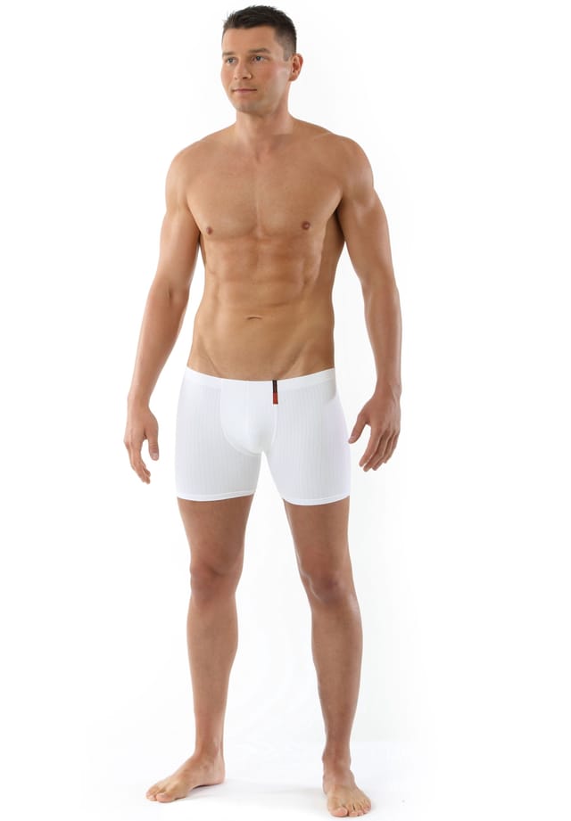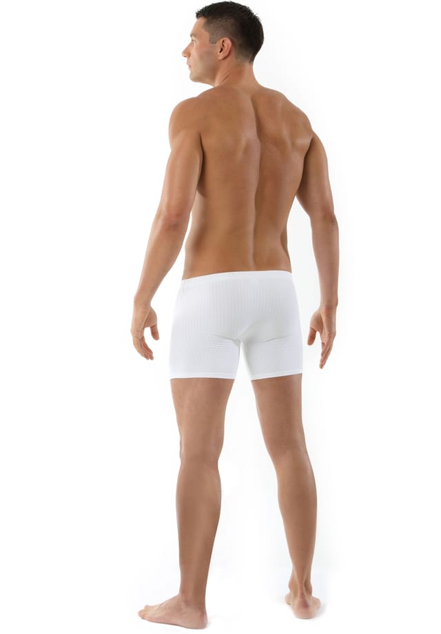Особенности : Облегающие мужские ретро-шорты белого цвета с тонкими прозрачными полосками из легкой микрофибры