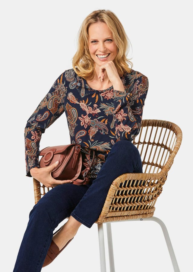 Описание товара: Рубашка с принтом, симпатичным узором пейсли и декоративной каймой. Женственный круглый вырез горловины и длинные рукава, манжеты которых украшены красивой декоративной пуговицей. Высококачественный материал, состоящий из мягкой, струящейся вискозы и эластичного эластана, обеспечивает первоклассный комфорт. Длина около 66 см для размера 46, около 62 см для размера 23.