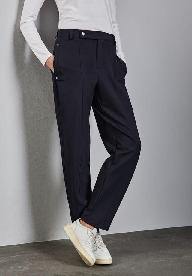 Описание товара: Женские брюки Street One Женские брюки Street One в цвете Deep Tint Blue — это абсолютный must-have для модниц. Благодаря своему повседневному крою, высокой талии и зауженным брючинам они идеально сочетают в себе стиль и комфорт. Носите ли вы их в офисе или на отдыхе, эти брюки порадуют вас. Высококачественные материалы Брюки изготовлены из смеси вискозы с эластичной тканью, что обеспечивает удобную посадку и оптимальную свободу движений. Материал прочный и простой в уходе, поэтому вы сможете наслаждаться брюками долгое время. Изысканный дизайн Боковые карманы предлагают практичное место для хранения мелких предметов и придают брюкам повседневный вид. Высокая талия подчеркивает талию, а зауженные брючины придают ногам привлекательный силуэт. Универсальные сочетания Женские брюки Street One можно комбинировать по-разному. Носите их с шикарным блейзером и туфлями-лодочками для элегантного образа в офисе или с повседневной рубашкой и кроссовками для непринужденного образа вне работы. Возможности безграничны! Подробности о товаре:, Женские брюки, свободный крой, высокая талия, зауженные штанины, боковые карманы, смесь вискозы с эластичным составом, материал: 61% вискоза, 32% полиамид, 7% эластан