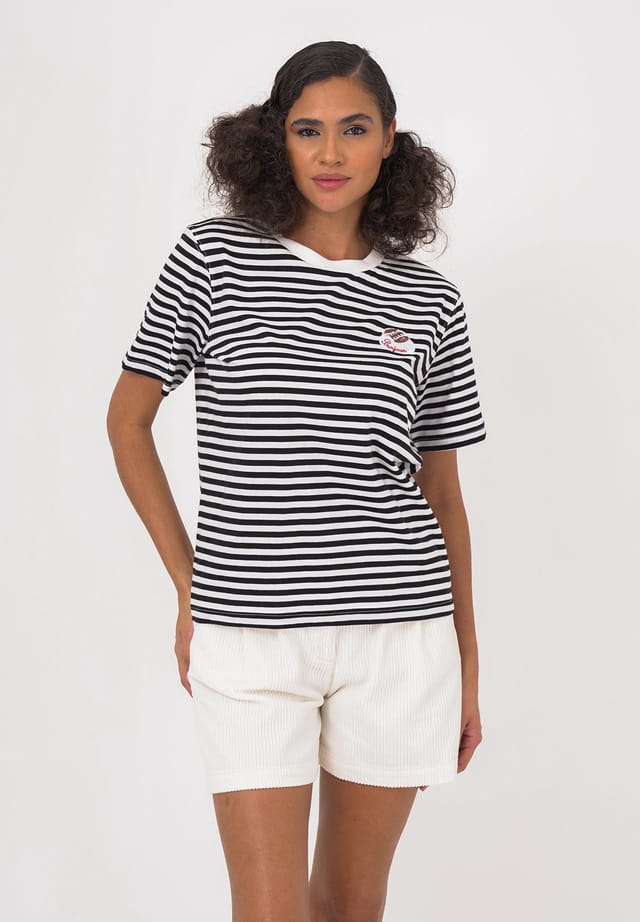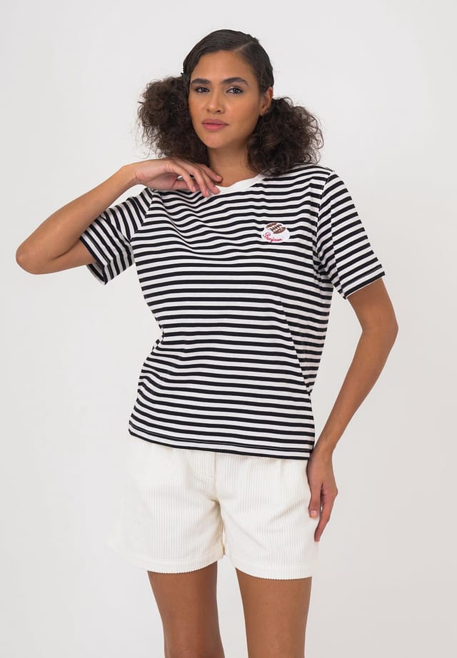 Описание товара: Эта стильная футболка станет прекрасным дополнением к вашему повседневному гардеробу. Благодаря своему прямому крою и классическому круглому вырезу она обеспечивает высокий уровень комфорта и свободу движений. Короткие рукава и удобный материал обеспечивают воздушное ощущение, идеально подходящее для теплых дней. Вышитый мотив и полосатый рисунок придают футболке модный и свежий вид. Ее можно комбинировать разными способами, и она идеально подходит для повседневного стиля casual.